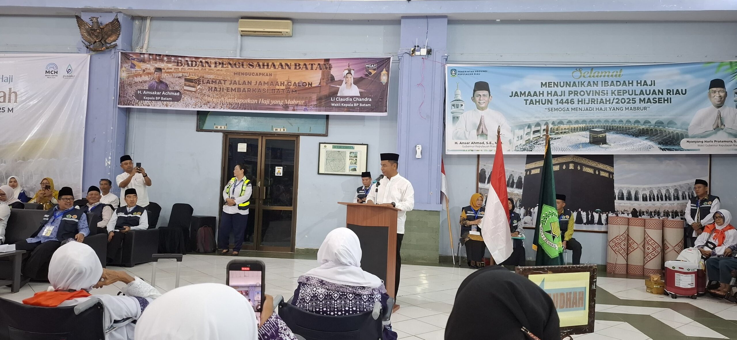 CJH Kampar yang tergabung dalam Kloter 05 BTH pada saat akan berangkat terlebih dahulu mengikuti acara pelepasan oleh Pemerintah Daerah Kabupaten Kampar yang dilepas secara langsung Bupati Kampar H Ahmad Yuzar di Asramah Haji Batam.